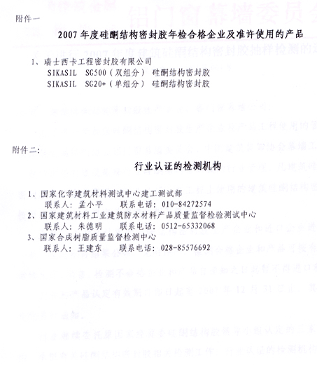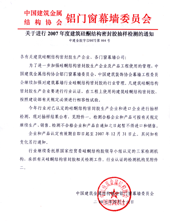 關(guān)于進(jìn)行2007年度建筑硅酮結(jié)構(gòu)密封膠抽樣檢測的通知